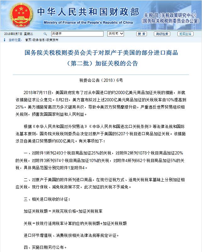 同时国务院关税税则委员会也发布了2018第6号公告,对原产于美国的部分进口商品(第二批)加征关税,列出了上述5207个税目的清单共4个附件