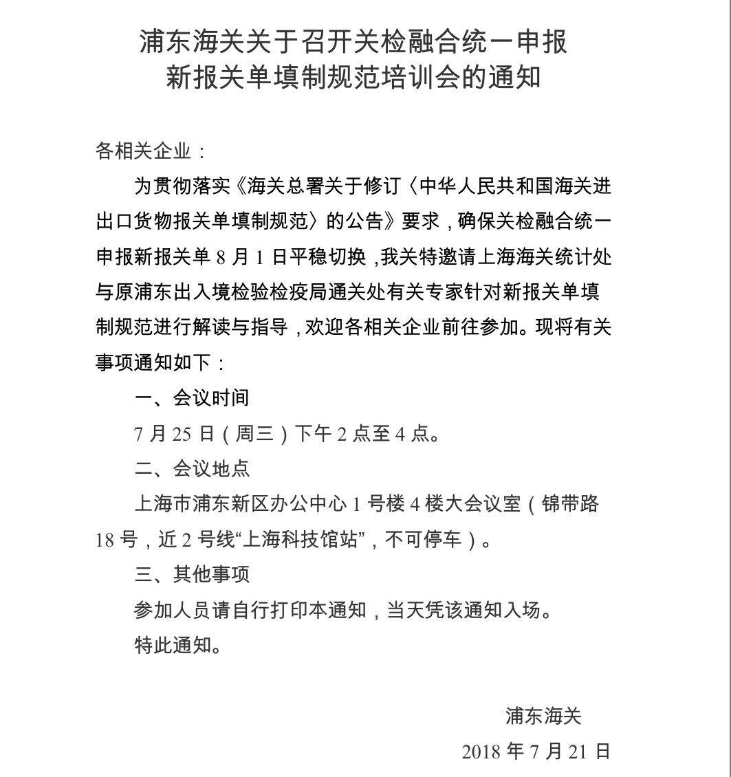 昨天下午小编又参加了由上海浦东海关举办的关检融合统一申报培训会,为大家带来几条最新情报: